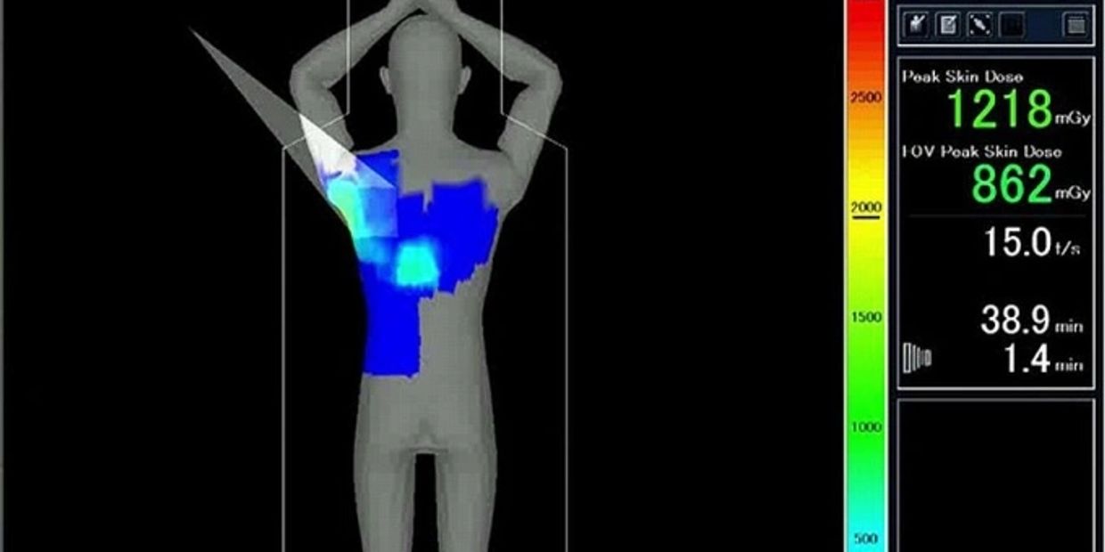 The DTS provides real-time data on the delivery of radiation during these interventional procedures via a detailed, intuitive, color-coded, 3-D map of the skin-dose distribution on a graphic of the patient. It highlights, with changing colors, if and when an area targeted to receive radiation should be changed to distribute the skin dose and minimize the chances of locally concentrated radiation exposure.